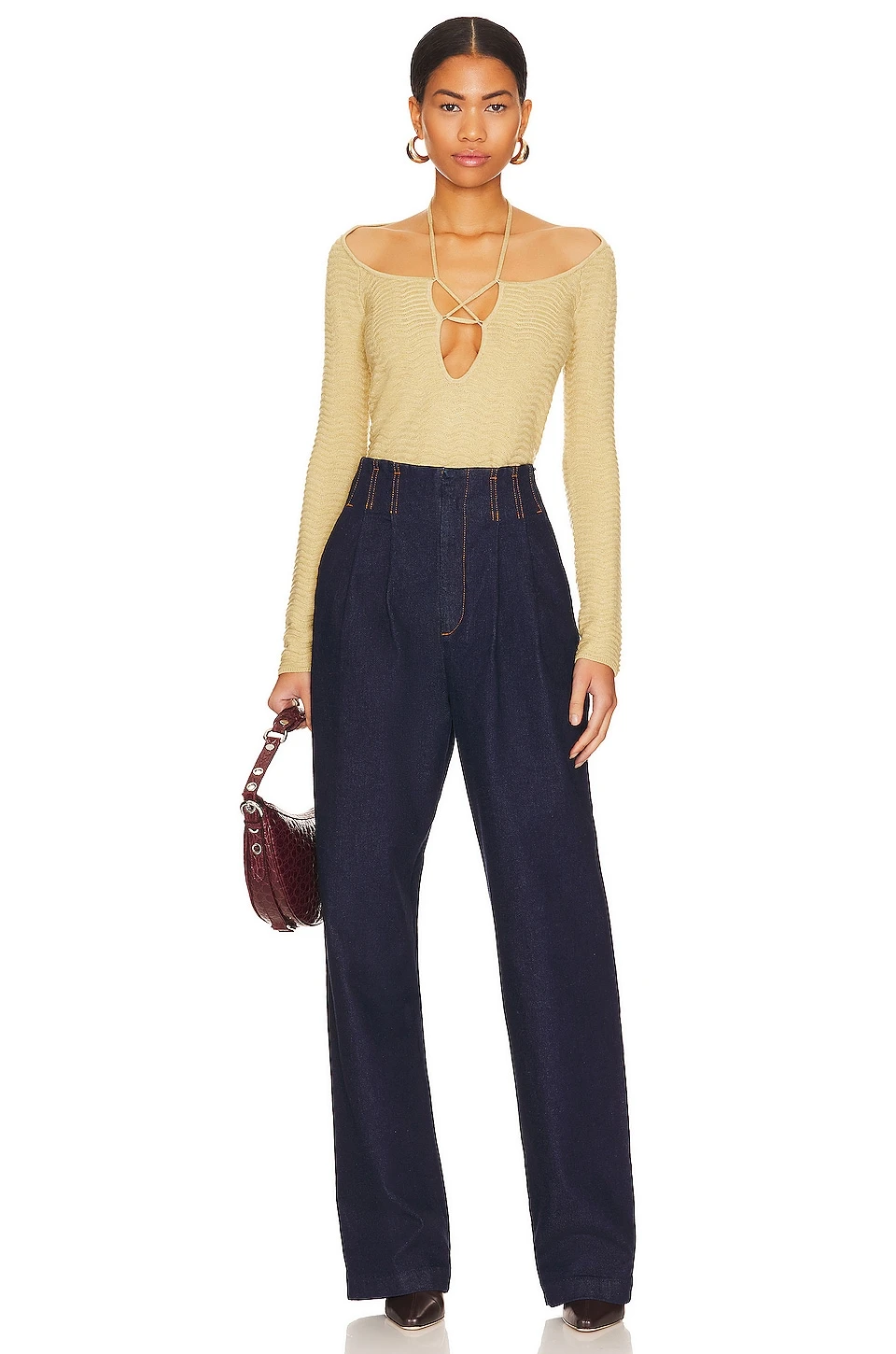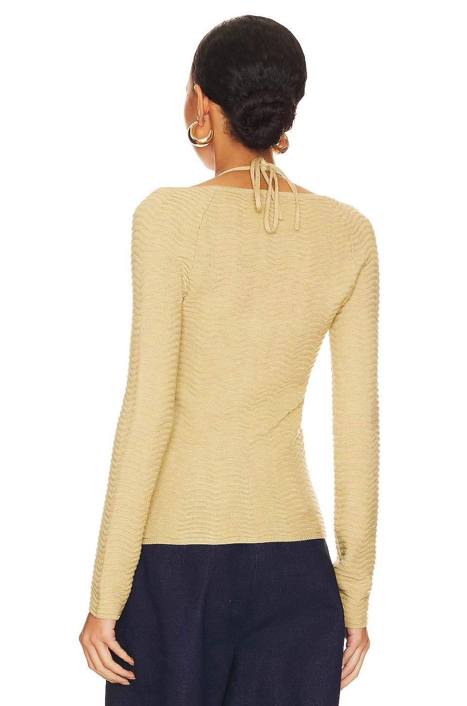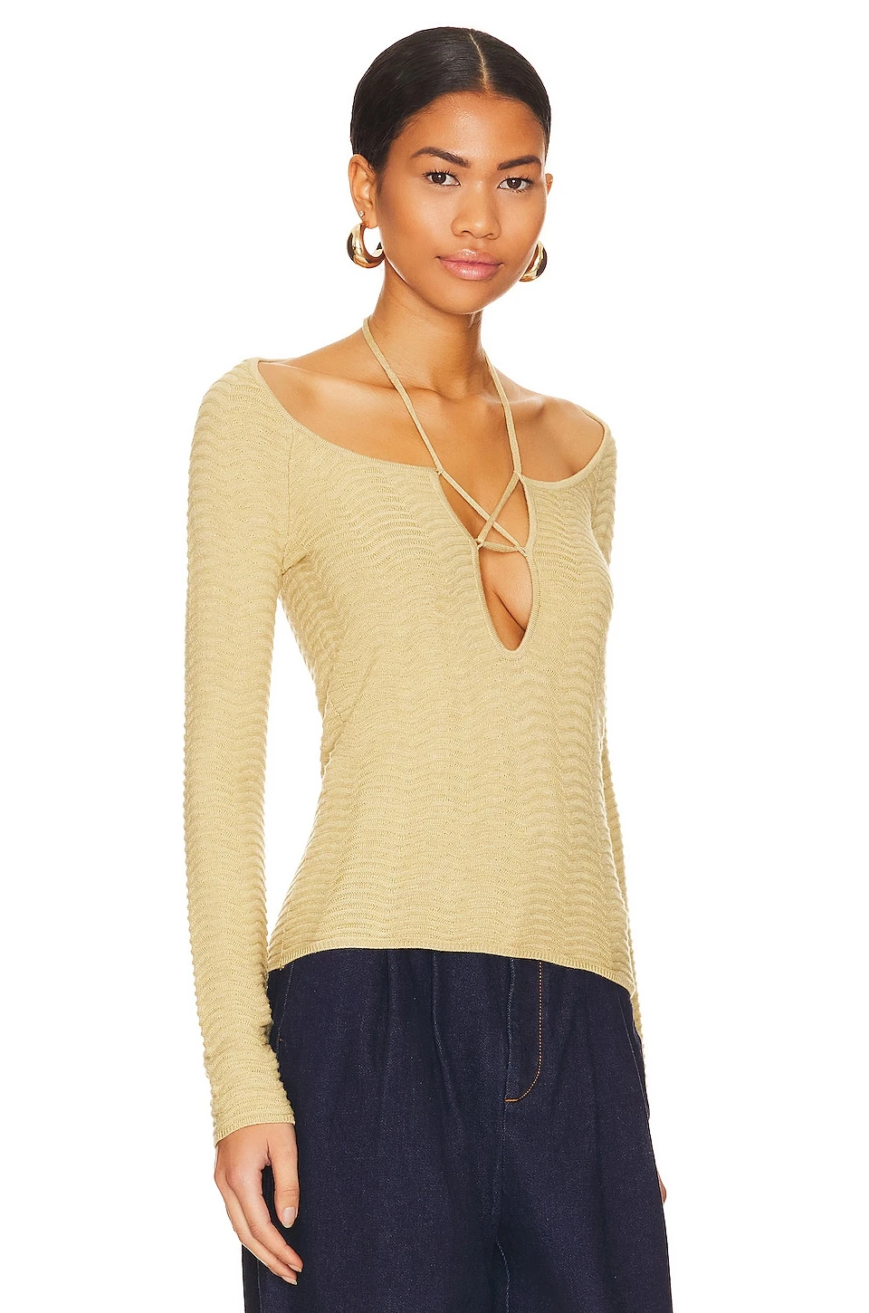 - Crisscross detail at bust with halterneck tie closure